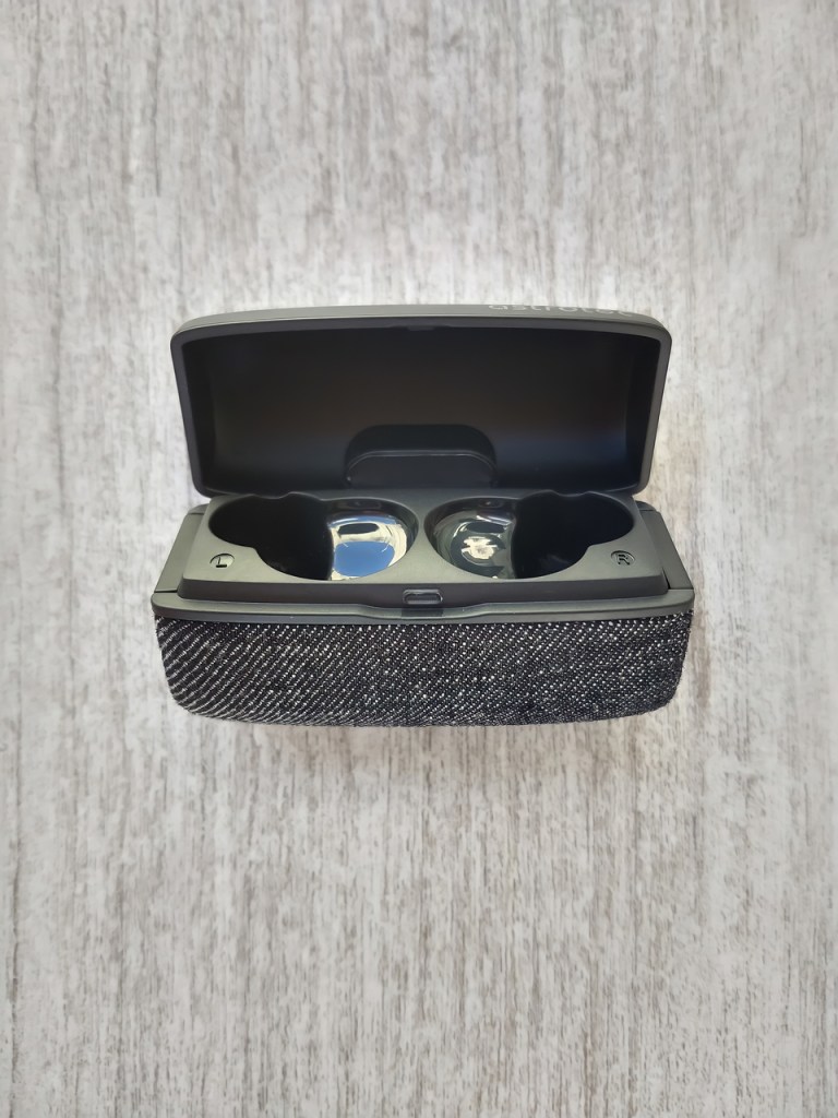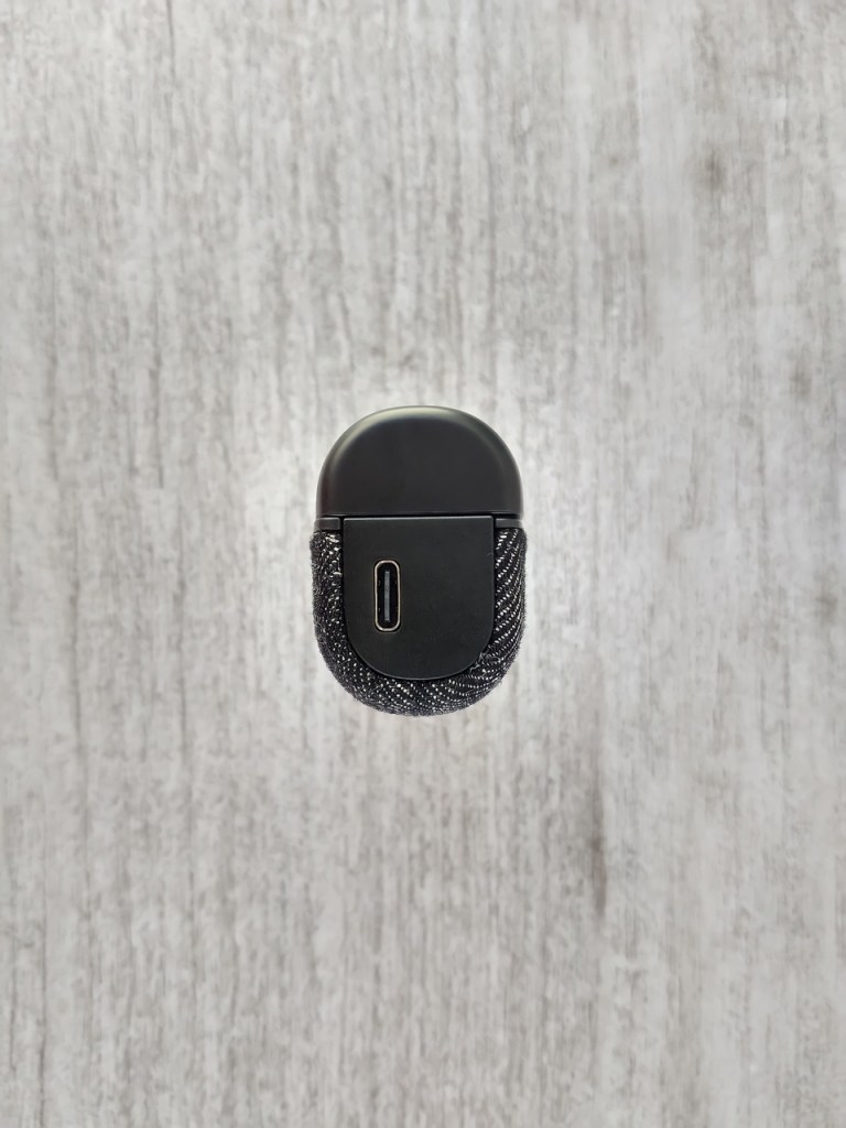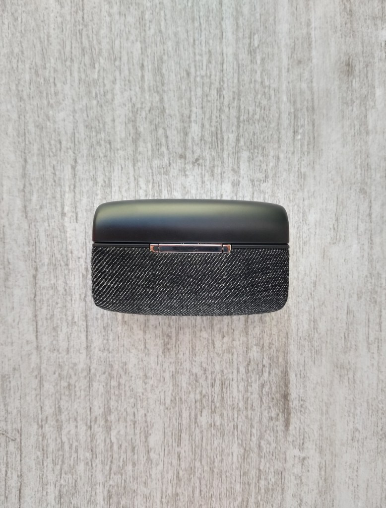 Case (ou estojo de carregamento). A Case também é bem leve e muito bonita, ela tem um design como se fosse um acessório de moda, de um produto que preza pela elegância. Parte da Case é revestida por um tecido que lembra um Jeans. Traz beleza mas também é preciso ter um pouco de cuidado, porque tecidos desfiam, e esse não é diferente, se você colocar a Case no bolso de uma calça junto com uma chave, ou numa mochila com outros objetos pontiagudos, o tecido pode ser danificado.
