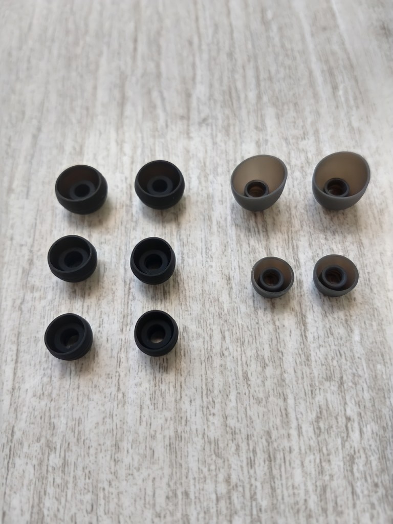 As de cor cinza só vieram apenas dois pares, e foram nos tamanhos P e G (!). Achei estranho isso, não sei se foi só na minha unidade que veio assim ou se é do produto mesmo. Além disso, outra peculiaridade dessas eartips cinzas são que as de tamanho “G” tem um formato “cortado” na diagonal, e as de tamanho “P” não segue o mesmo formato das “G”. Fiz até questão de colocar uma foto com elas de cabeça pra baixo pra ficar melhor de visualizar. Achei diferente, só que infelizmente elas não me serviram porque o tamanho “G” não encaixou legal em mim.