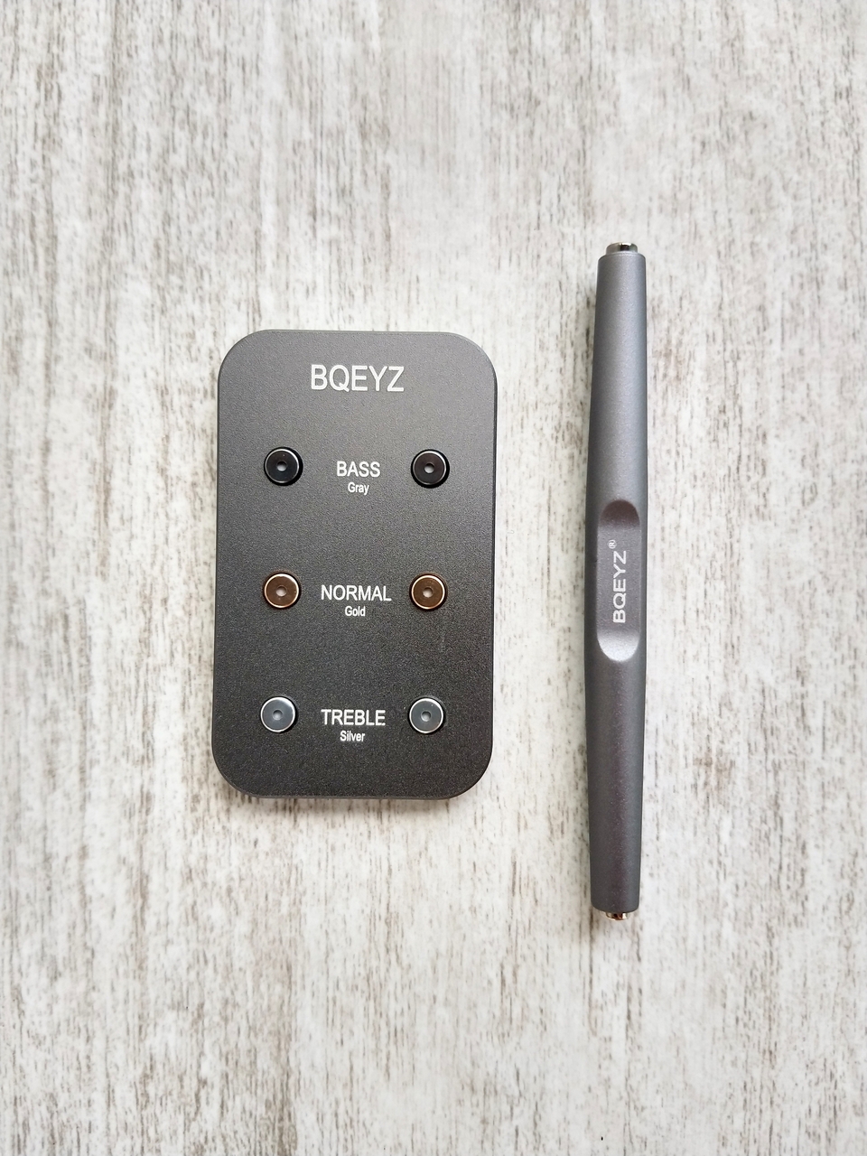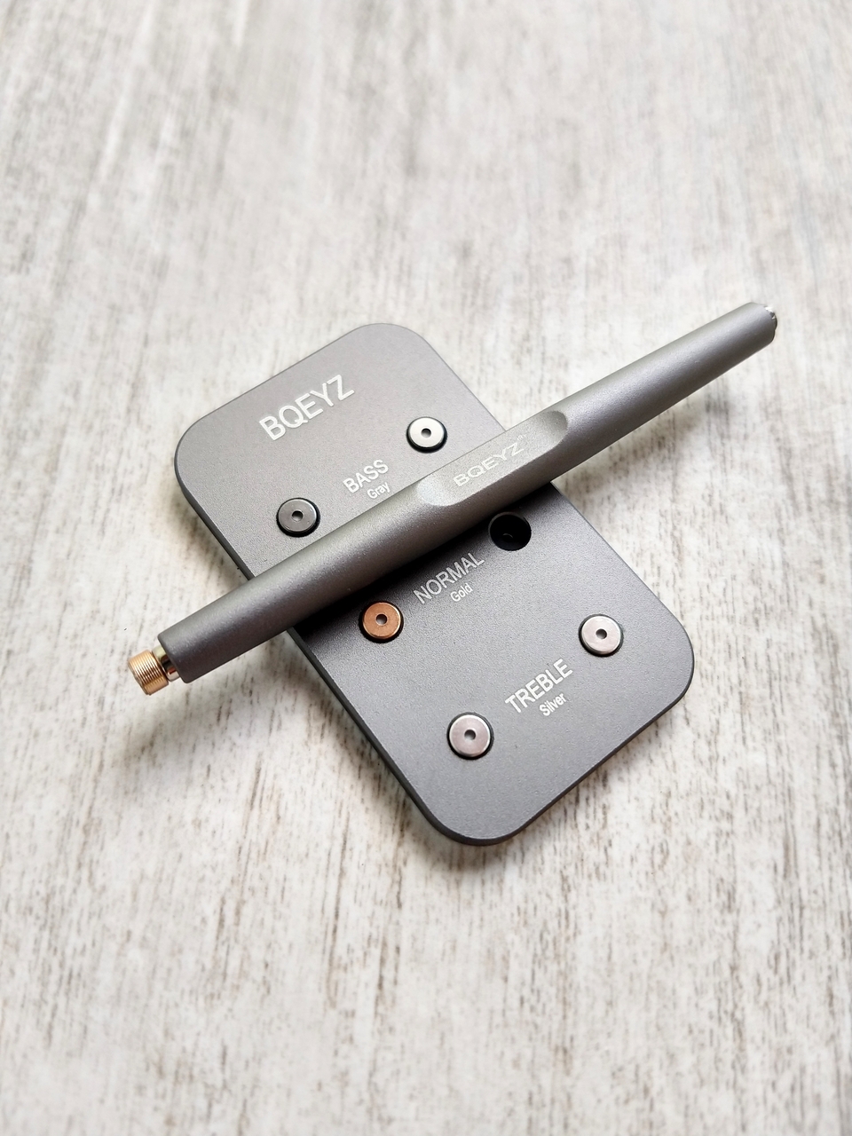 Filtros. O elemento de destaque no Autumn são os filtros destacáveis. Os filtros são capazes de mudar – em parte – a sonoridade do fone. Ele vem com 3 pares de filtros diferentes: Bass (gray/cinza), Normal (gold/dourado), e Treble (silver/prata). O lance aqui é que esses filtros podem ser removidos por meio de magnetismo, pra isso, o produto acompanha uma “bastão” com um imã na ponta, que é o que faz a troca dos filtros. Basta encostar o bastão no filtro e remover/colocar ele no fone.