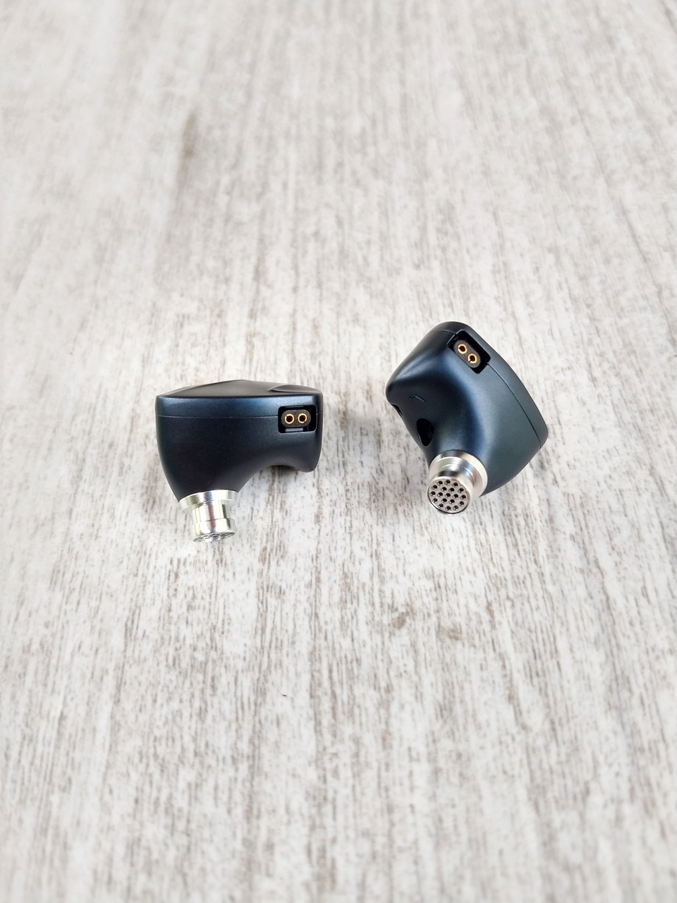 Conectores 2 PIN. O fone vem com conectores tipo 2 pinos, que pra mim, é algo melhor que MMCX, porque não rotaciona e é mais fácil de tirar e colocar… só vejo vantagens nesse tipo de conector. Esses em questão ficam com um pequeno espaço entre o conector e o fone, o que eu entendi como algo bem vindo porque facilita na hora de tirar, é só colocar uma unha ali e puxar e o conector sai fácil fácil. Não sei se isso foi pensado pela empresa mas certamente eu achei que foi algo bem positivo. Os conectores tem a indicação de lado L e R (esquerdo e direito), assim como os fones também tem a indicação. Isso é sempre bom pois facilita a vida de quem tá iniciando no hobby.
