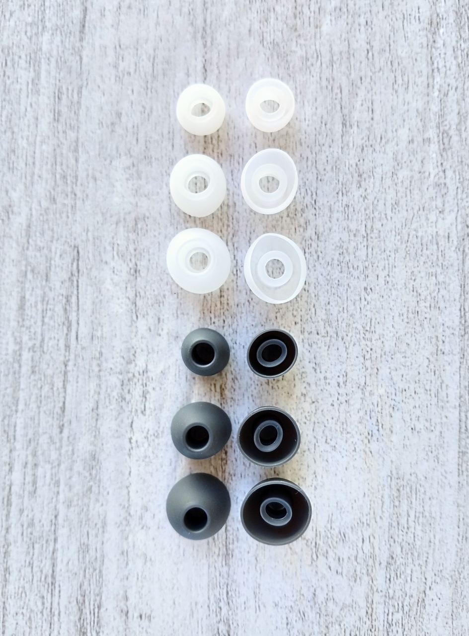 Eartips (ou ponteiras/borrachinhas). Como de costume, vamos falar sobre as ponteiras inclusas no pacote. São dois tipos em silicone: as “Celest 221 Vocal Eartips” (Brancas) e as “Celest 822 Eartips” (Cinzas). Vamos nos basear pelas cores. As brancas são mais em estilo Wide Bore (bocal aberto), e eu sempre tendo a evitar esse tipo de ponteira porque sempre diminuem os graves. Daí, assim que vi as de cor cinza, já logo saltei os olhos… São bem parecidas com as ponteiras do 7Hz Salnotes Zero, e também me lembrou as do Letshuoer S12.