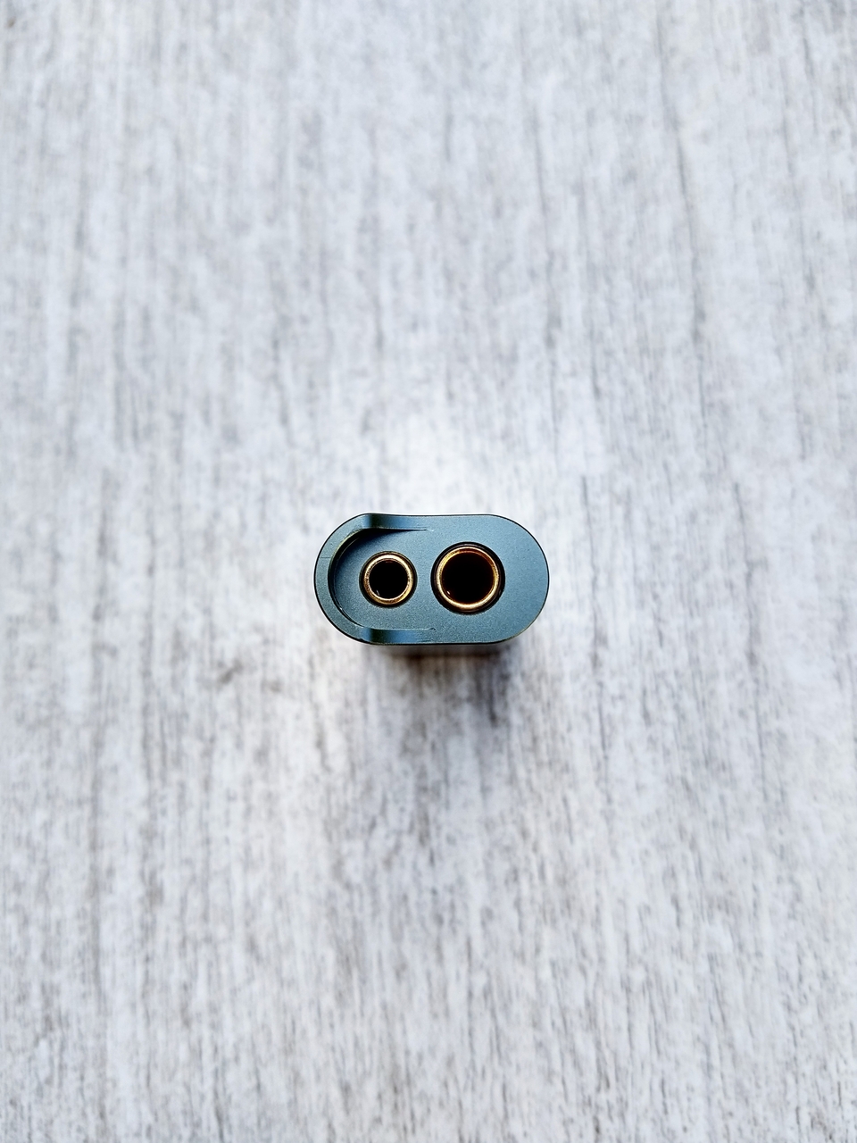O produto possui ao lado da entrada 3.5mm, um pequeno orifício para entrada de cordão de sustentação, caso alguém deseje pendurar o Dongle por uma corda. Na verdade, se vocês viram nas fotos, o que tem é uma elevação no design, e ali fica o espaço pra passar o cordão. No início eu até me preocupei com esse detalhe por causa dos fones que tem o plugue em L, mas eu testei aqui com alguns IEMs que tenho com esse tipo de plugue e não tive problema nenhum com eles, encaixaram tranquilamente.
