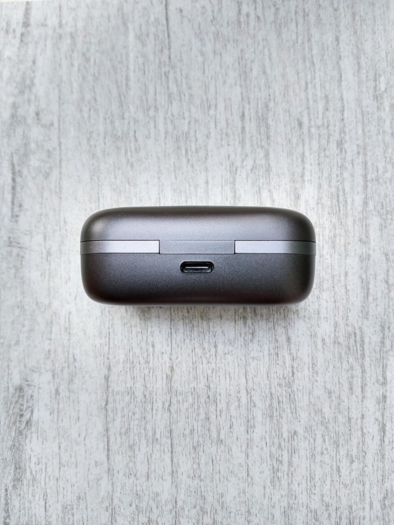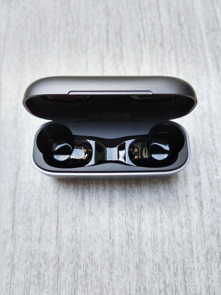 Case (ou estojo de carregamento). O fone com o menor Case que já testei (até o momento), muito pequeno e discreto… e leve! Como de costume, tampa com fechamento magnético e fones fixados ao interior por magnetismo também (e os fones não caem de jeito nenhum, nem colocando muito força!).