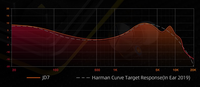 The sound of the FiiO JD7 is the famous Harman target (Harman company’s compensation curve), FiiO itself makes a point of mentioning in the product announcement that the IEM follows this curve, so there’s not much mystery. Of course, here we will find a small variation of the original curve, but it’s possible to conceive that it’s the same proposal. In short, the Harman target sound is basically: emphasized bass, recessed mids, slightly more enhanced upper mids, and more moderate treble.