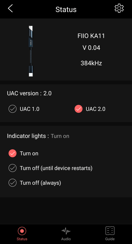 As you can see from the screenshots, the App has limited functions for the KA11. It allows you to adjust the LED configuration, switch between UAC 1.0 and UAC 2.0 modes, and modify digital filters. According to the company, the App only works on Android devices. If you choose the Lightning version, will be compatible with Apple devices, you only won’t have access to the FiiO Control App.
