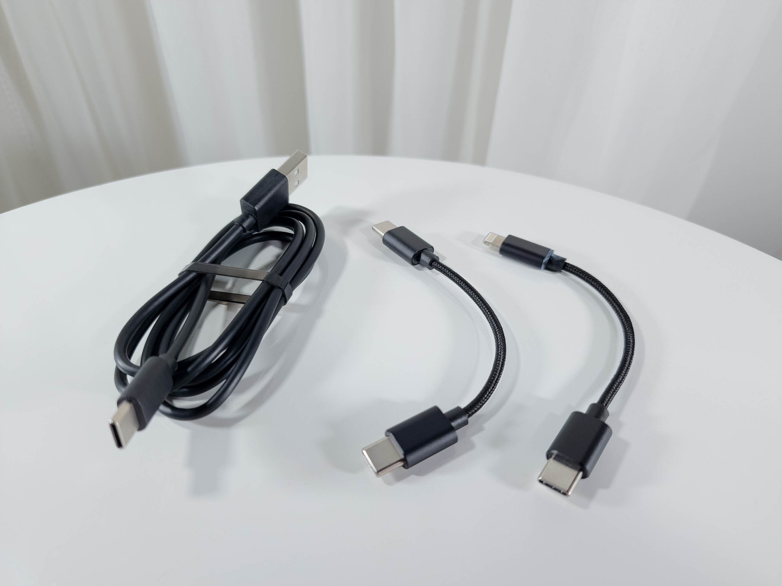 Accessories. I have to admit that the included accessories kit was very good, with 3 types of cables included: 1 USB-A to USB-C cable (100cm), 1 USC-C to USB-C cable (12cm), and 1 USB-C to Lightning (iPhone) cable (12cm). It also came with two rubber bands to attach the DAC/AMP to a smartphone, one rectangular one to place between the devices and another that looks like a butterfly, which would be used to hold the Q11 to the smartphone. In practice, I confess that I didn’t even use these rubber bands with the smartphone, the explanation I think I already said in the paragraph where I talk about portability. The Q11 doesn’t have a protective cover (at least not until the moment I write the review).