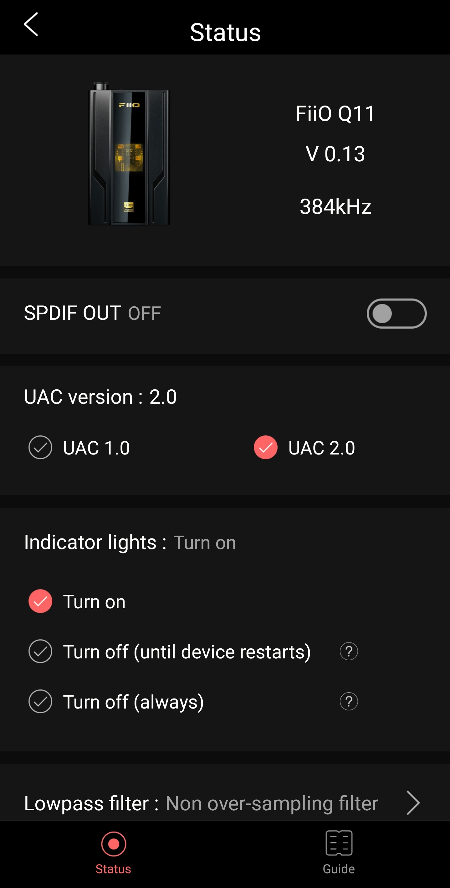 – The behavior of the main Q11 LEDs is as follows: Blue color means the Q11 is on and running PCM files up to 48kHz; yellow color means it is running PCM files above 48kHz; and green color means it is running DSD files. If anyone is bothered by the top LED, it’s possible to turn it off through the FiiO Control App and leave it in two modes: always off or turn back on after restart.