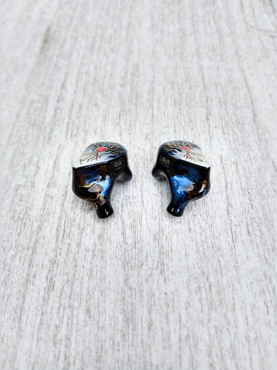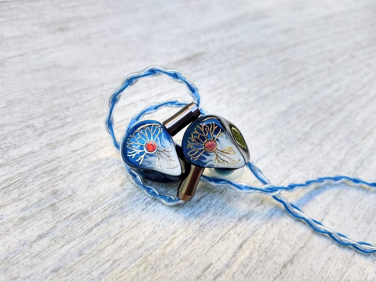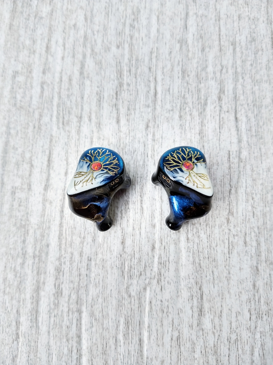 Começar falando do que a gente já vê logo de cara nesse fone, que é o trabalho estético do fone. A Kinera já vem se destacando no hobby por trazer esse trabalho de pintura bem diferenciado dos demais fones do mercado. Confesso que num primeiro momento, eu vi apenas a versão branca do fone e achei ele meio esquisito, não me encheu os olhos, só que depois eu vi que tinha disponível essa versão preta/azul também, aí a coisa já mudou, tenho preferência por fones escuros. O fone é muito mais bonito em mãos do quê por fotos.