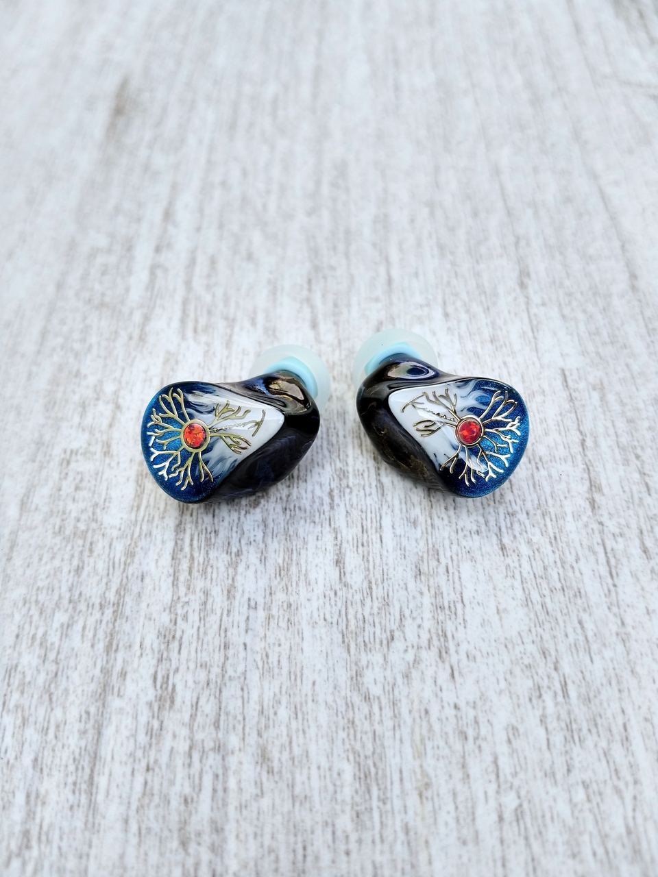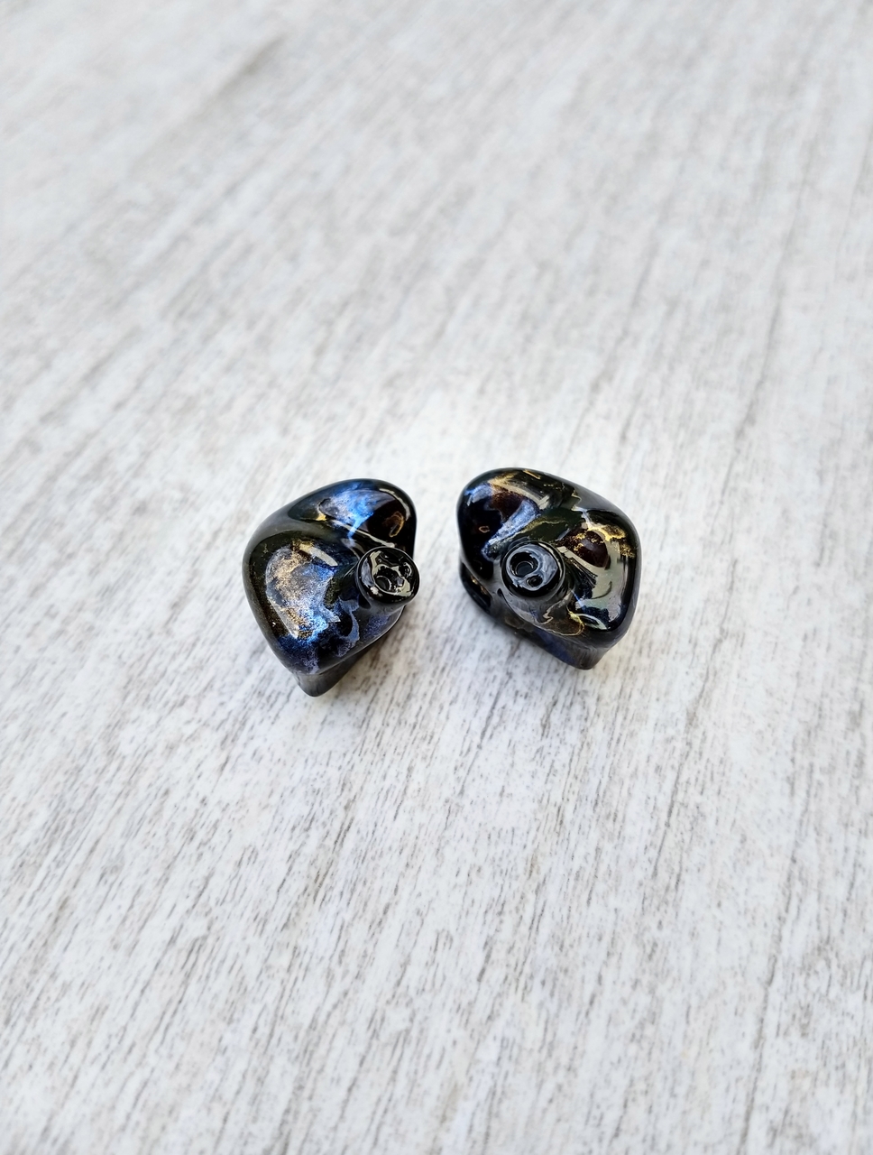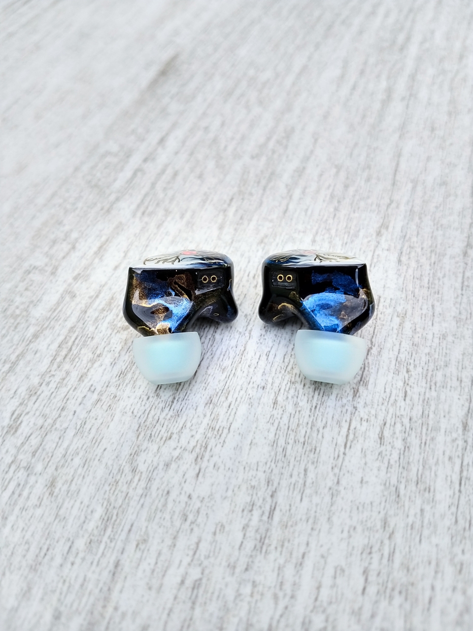 Começar falando do que a gente já vê logo de cara nesse fone, que é o trabalho estético do fone. A Kinera já vem se destacando no hobby por trazer esse trabalho de pintura bem diferenciado dos demais fones do mercado. Confesso que num primeiro momento, eu vi apenas a versão branca do fone e achei ele meio esquisito, não me encheu os olhos, só que depois eu vi que tinha disponível essa versão preta/azul também, aí a coisa já mudou, tenho preferência por fones escuros. O fone é muito mais bonito em mãos do quê por fotos.