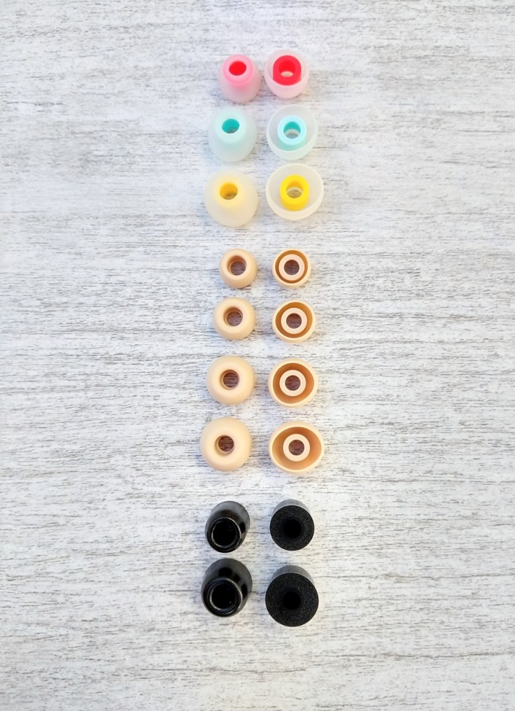 Eartips (ou ponteiras/borrachinhas). Vieram dois tipos de eartips em silicone e um tipo em Foamtips (espuma). Segundo a Kinera a configuração das eartips é a seguinte: