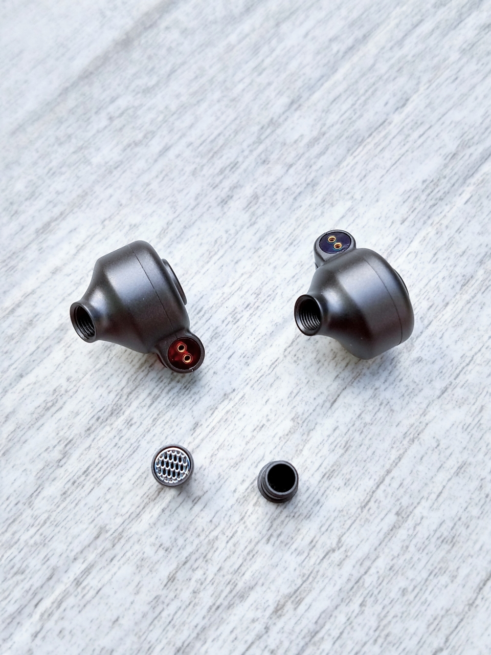 Filtros destacáveis. O D13 tem a possibilidade de destacar os bocais do fone, gerando assim a possibilidade de aplicar um novo bocal com um novo filtro. Os bocais (filtros) são: os prateados (que já vem direto nos fones) e os dourados (inclusos como acessórios). O mecanismo é simples, rosquear e desrosquear. A qualidade de construção da peça é muito boa, não tem complicação nenhuma na hora de encaixar ou na hora de retirar o bocal. Os filtros prateados foram os escolhidos para fazer a avaliação do som desse fone. A análise da parte sonora dos filtros será no parágrafo exclusivo dentro do bloco “aspectos sonoros”.