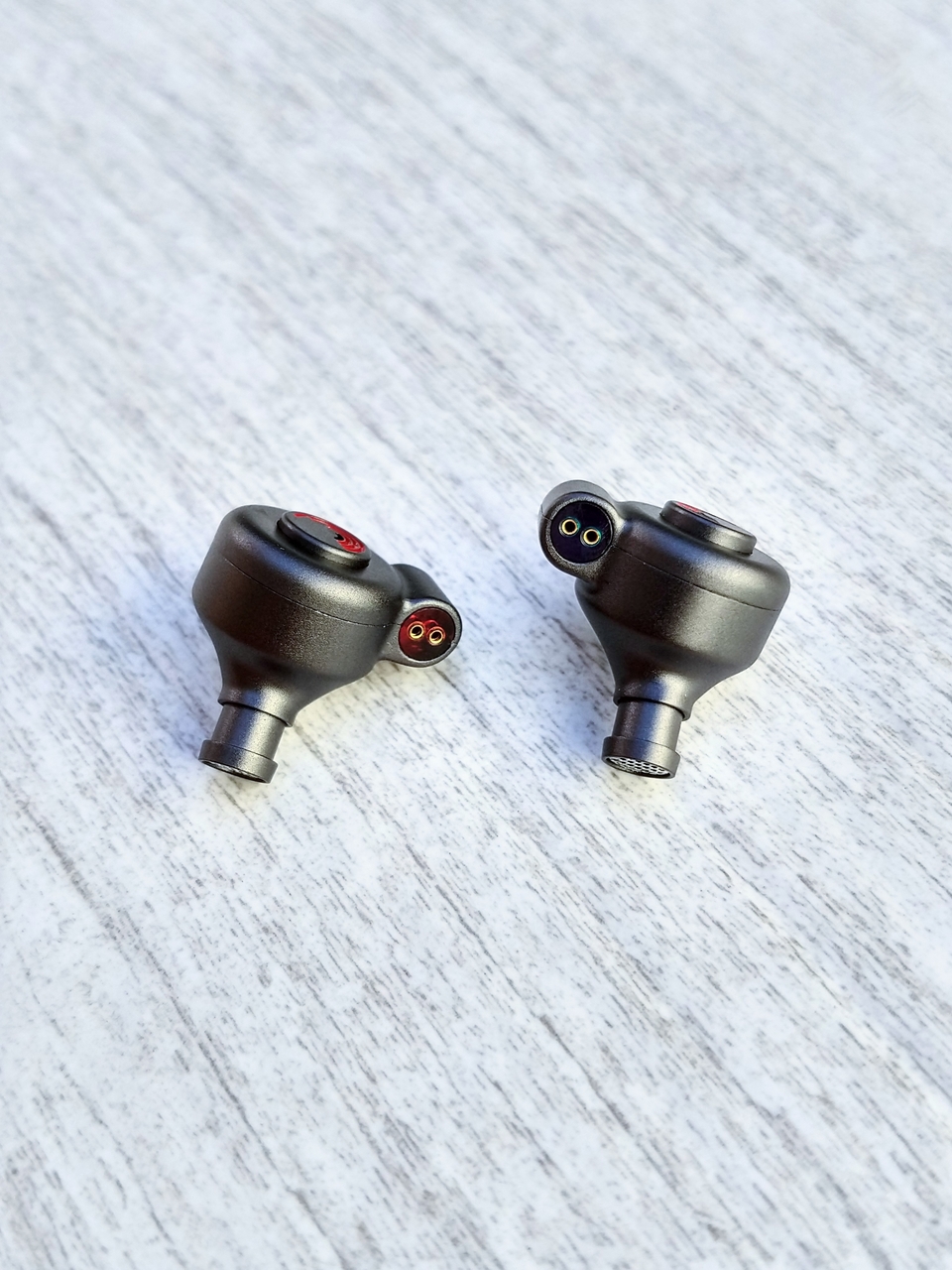 Conectores. O D13 possui conectores do tipo “2 pin” (dois pinos), que é a minha preferência e está voltando a ser o tipo de conector mais almejado pelos proprietários de IEMs. Na minha opinião, esse tipo de conector deixa o fone numa posição fixa, isso é, ele fica mais estável, diferente de conectores MMCX que acabam rotacionando (alguns de forma até excessiva). A indicação para encaixe dos pinos no fone é feita pelo uso das cores: Vermelho= lado direito, e Azul= lado esquerdo. O corpo dos fones até vem com a indicação de encaixe pelas letras L & R, porém os conectores não possuem as letras. Como disse antes, toda a operação vai ser baseada pelas cores. Não percebi nenhum problema na conexão dos pinos com os fones, tudo como o esperado.