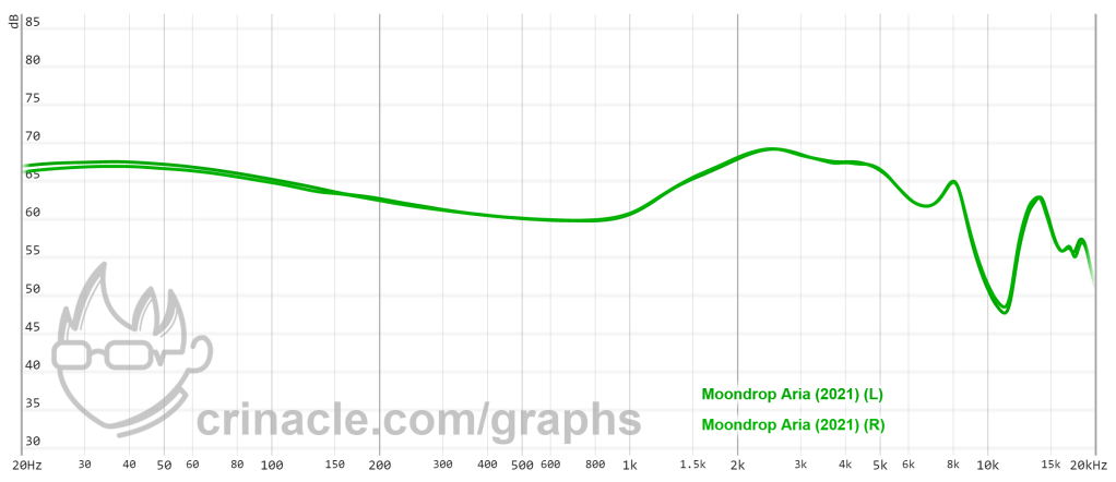 A sonoridade do Moondrop Aria segue a curva de compensação própria da Moondrop, que é a chamada “VDSF target curve” (Virtual Diffuse Sound Field). Ainda que seja uma curva desenvolvida pela própria empresa, ela pode ser vista como uma variação da curva de compensação da Harman (a Harman Target). Segundo a Moondrop, a curva VDSF tenta imprimir um som mais realista possível.