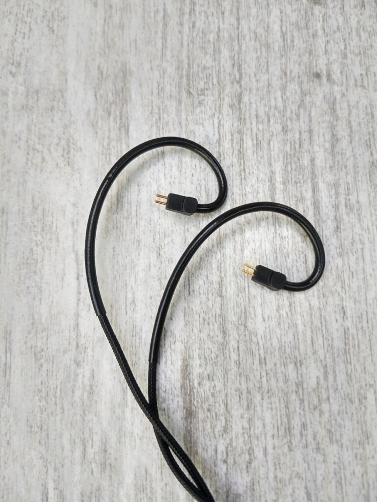 Earhooks (ou ganchos de orelha). Os earhooks foram uma grata surpresa, gostei muito, é leve, semirrígido, confortável, tem uma curvatura que eu achei perfeita (nos meus ouvidos), bem liso, pequeno, discreto, só tenho elogios, encaixou como uma luva. Eu já testei cabos de fones mais caros que não tem a eficiência que os earhooks do Aria tiveram. Essa é uma peça que eu dou muita importância porque é daqui que começa o encaixe e o conforto do fone.