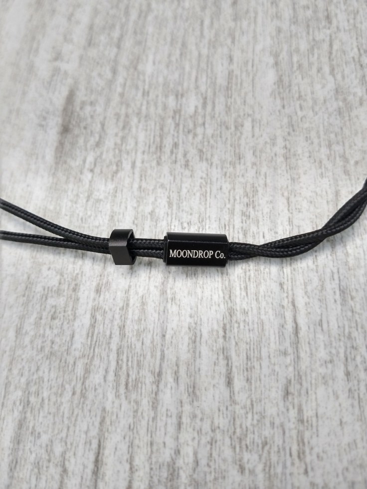 O “Chin Slider” (aquela peça que ajusta a divisão dos cabos que vão para os falantes). Funciona, mas eu daria 99% de garantia. Pelo que eu testei aqui, ele não escorrega, mas assim, cabo em estilo Paracord é um pouco mais propenso a escorregar do que um cabo revestido com plástico.