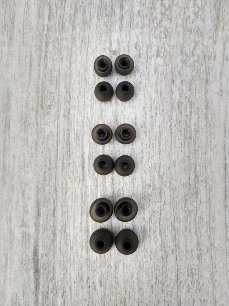 Eartips (ou ponteiras/borrachinhas). Começando pelas eartips. O pacote foi bem restrito, vem apenas 6 pares em silicone (2 pares tamanho P, 2 pares tamanho M, 2 pares tamanho G), todas do mesmo material, e só. Pra minha surpresa, elas funcionaram comigo, não precisei fazer nenhuma mudança, e acho que pra outras pessoas elas vão ser funcionais também. Então, a análise do Aria foi com as eartips no tamanho M.