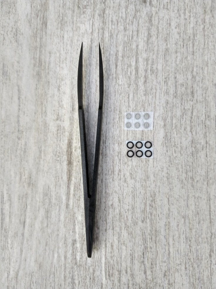 Outros acessórios inclusos no pacote vem: uma pinça, e alguns pares de filtros extras (na verdade são aquelas “grades” de proteções do bocal). Não sei muito se esses acessórios irão ser de muita utilidade pra mim (e nem espero ter que usá-los). A pinça é meio grande pra manusear com um item tão pequeno como são essas “gradinhas”.