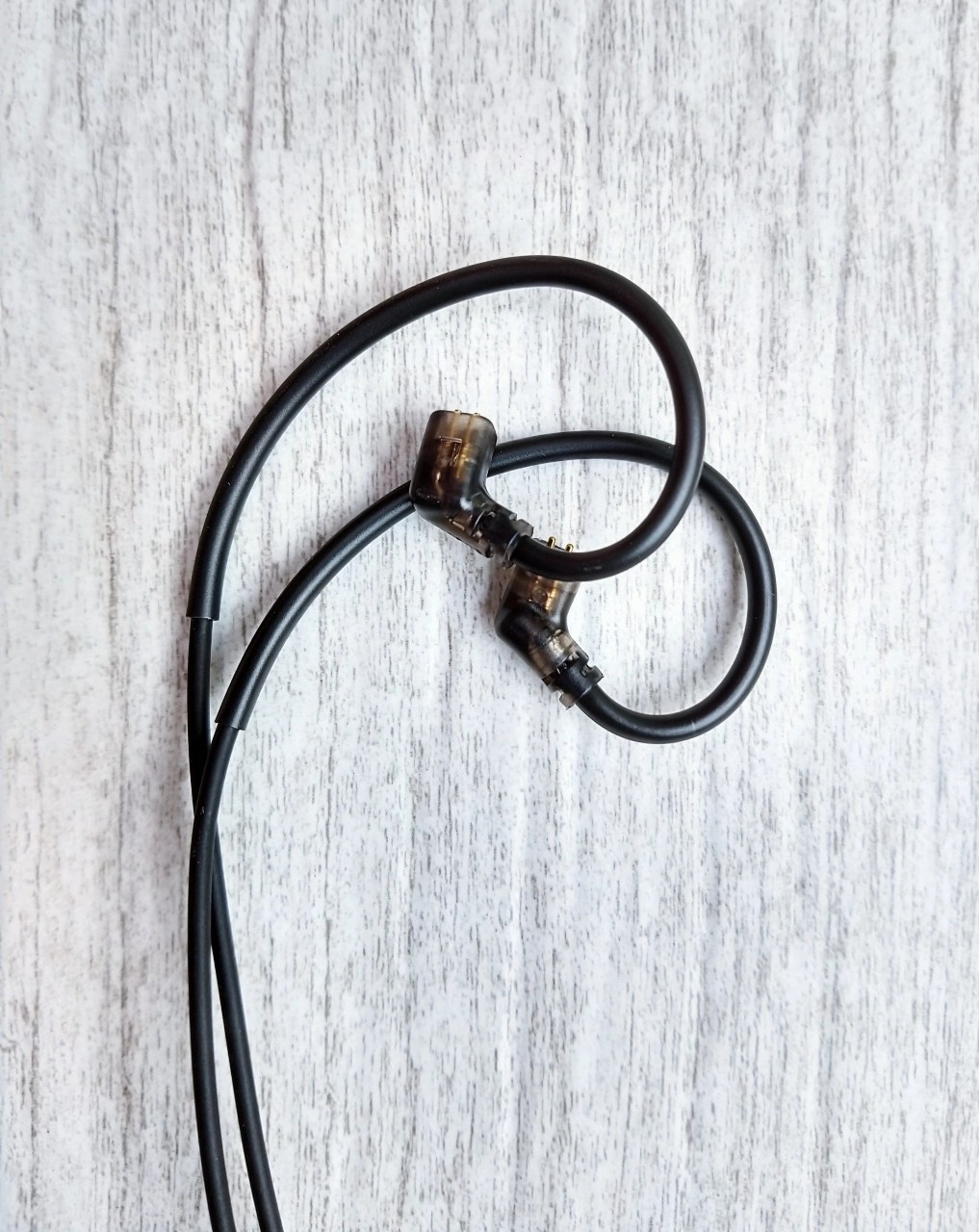 Earhooks (ou ganchos de orelha). Aqui eu achei um ponto positivo. A angulação pra mim ficou muito boa, ele vem contornando bem rente com a parte de trás da minha orelha e isso faz o fone ficar bem estável nos meus ouvidos. A peça é bem lisa, sem ondulação, não incomoda, traz um conforto muito bom. O earhook é quase que uma extensão do próprio cabo, agora, o material emborrachado dá lugar a uma peça de plástico.
