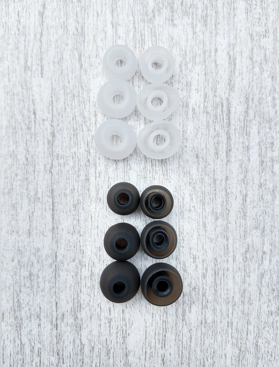 Eartips (ou ponteiras/borrachinhas). Começando pelo kit de ponteiras disponibilizado no pacote. Vieram apenas dois tipos de ponteiras em silicone: As “Atmosphere” (toda branca), nos tamanhos PP/P/M/G (o tamanho PP já vem no bocal fone), e as “Balanced” (toda preta), nos tamanhos P/M/G. Na tradução “Atmosphere” seria Atmosfera, que teria uma função de fazer o som ser mais aberto, arejado e com mais espaço. E a tradução de “Balanced” seria equilibrado, isso é, fazer o som soar mais “igual” entre as frequências.