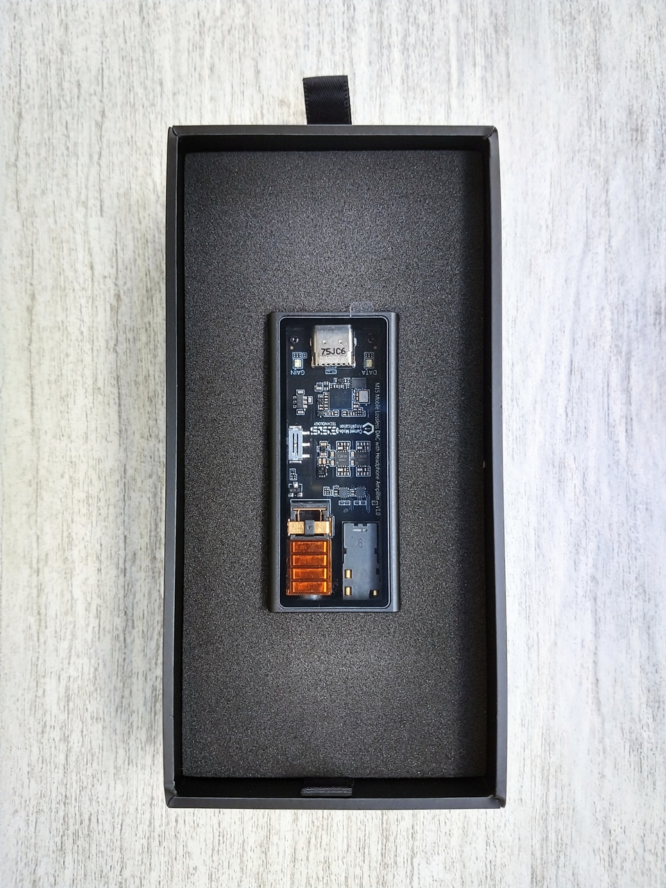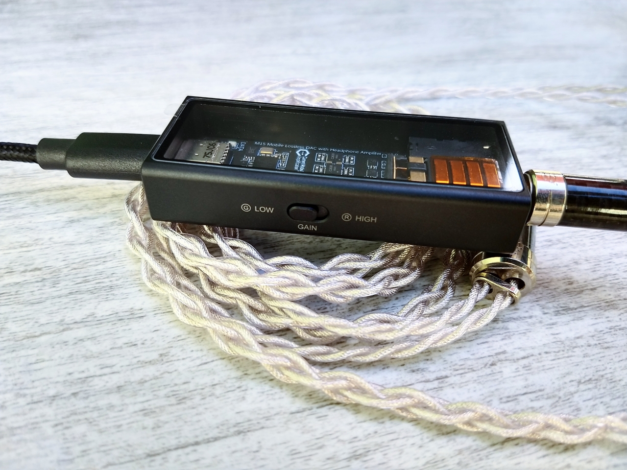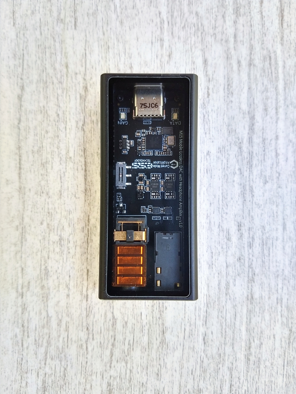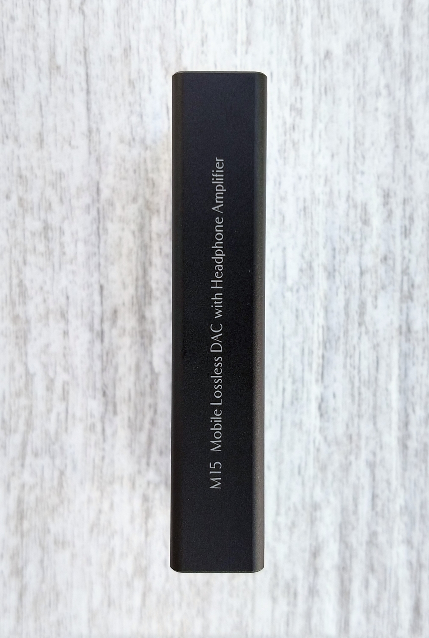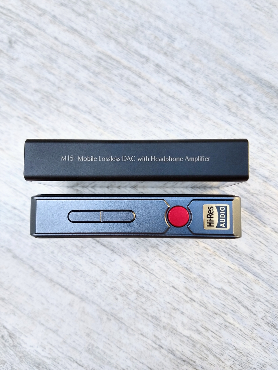 Então, como foi dito no parágrafo acima, a superfície superior do M15 está coberta por uma placa de vidro. Segundo a empresa, mesmo sendo vidro, o produto está seguro contra interferências eletromagnéticas. O restante do produto é todo em metal e produzido em uma peça única, sem aberturas (exceto pela parte onde fica o vidro). A qualidade dos materiais utilizado na construção do produto é excelente, ele é bem leve, bem arredondado também, sem quinas afiadas, traz um conforto muito bom ao toque e ao manuseio. Dos 3 dongles que testei com saída 4.4mm, acho que o M15 só não é mais leve do que o DD HiFi TC44C.