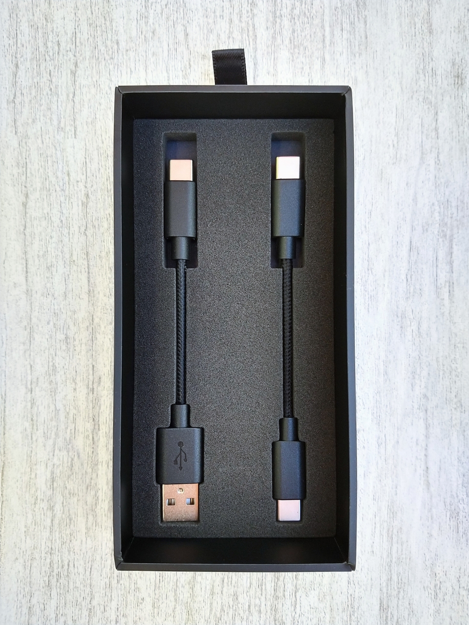 Cabos. O produto acompanha dois cabos de 12.5cm em estilo Paracord, um sendo USB-C para USB-C, e o outro, USB-C para USB-A. Os cabos são de ótima qualidade, bem “parrudos”, mostram ter bastante resistência, acabam sendo até um pouco rígidos por sua vez. A empresa colocou 2 cabos disponíveis – o que já é bom – porém na minha visão era pra ter colocado 3 cabos (ou 2 cabos e 1 adaptador). Acabou que a conexão Lightning (iPhone) não foi contemplada no pacote. Para isso, a pessoa precisa escolher no ato da compra se quer que o produto venha com um adaptador, mas isso vai adicionar um custo a mais no valor final.