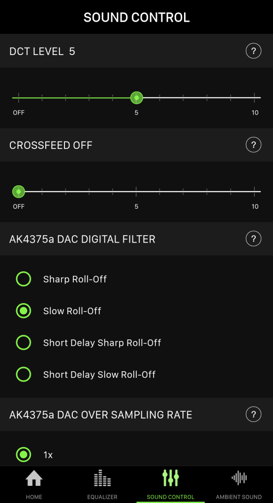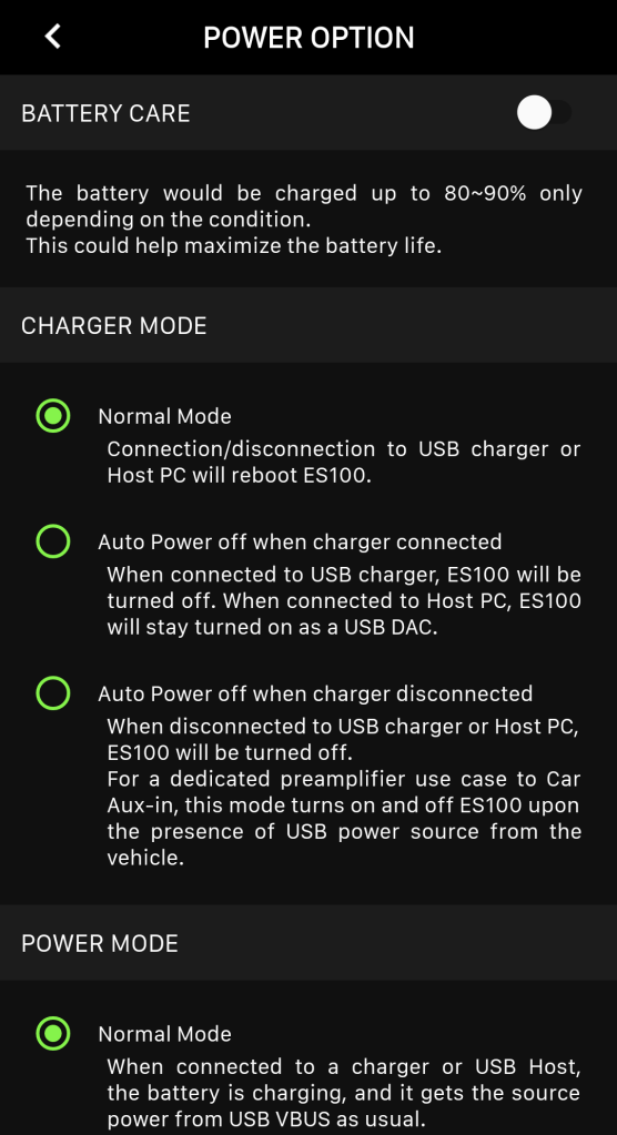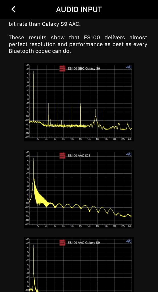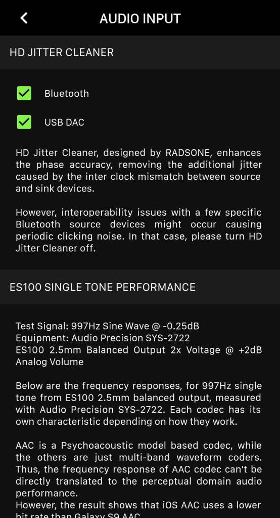 O ES100 MK2 conta com 2 recursos disponível no aplicativo para mudar a corrente da saída 3.5mm, entre 1x (Normal Mode) ou 2x (High Performance Mode) mais. Na prática, eu demorei pra conseguir distinguir entre essas duas opções, até cogitei não está ouvindo nada de diferente entre elas, mas depois de um tempo pude perceber que houve um discretíssimo aumento na intensidade dos graves, algo como se o fone tivesse ganhado mais “músculos”, um som mais vibrante. Mas essa coisa toda de subjetividade pode nos passar uma rasteira, então há de se investigar se eu não caí num efeito placebo.