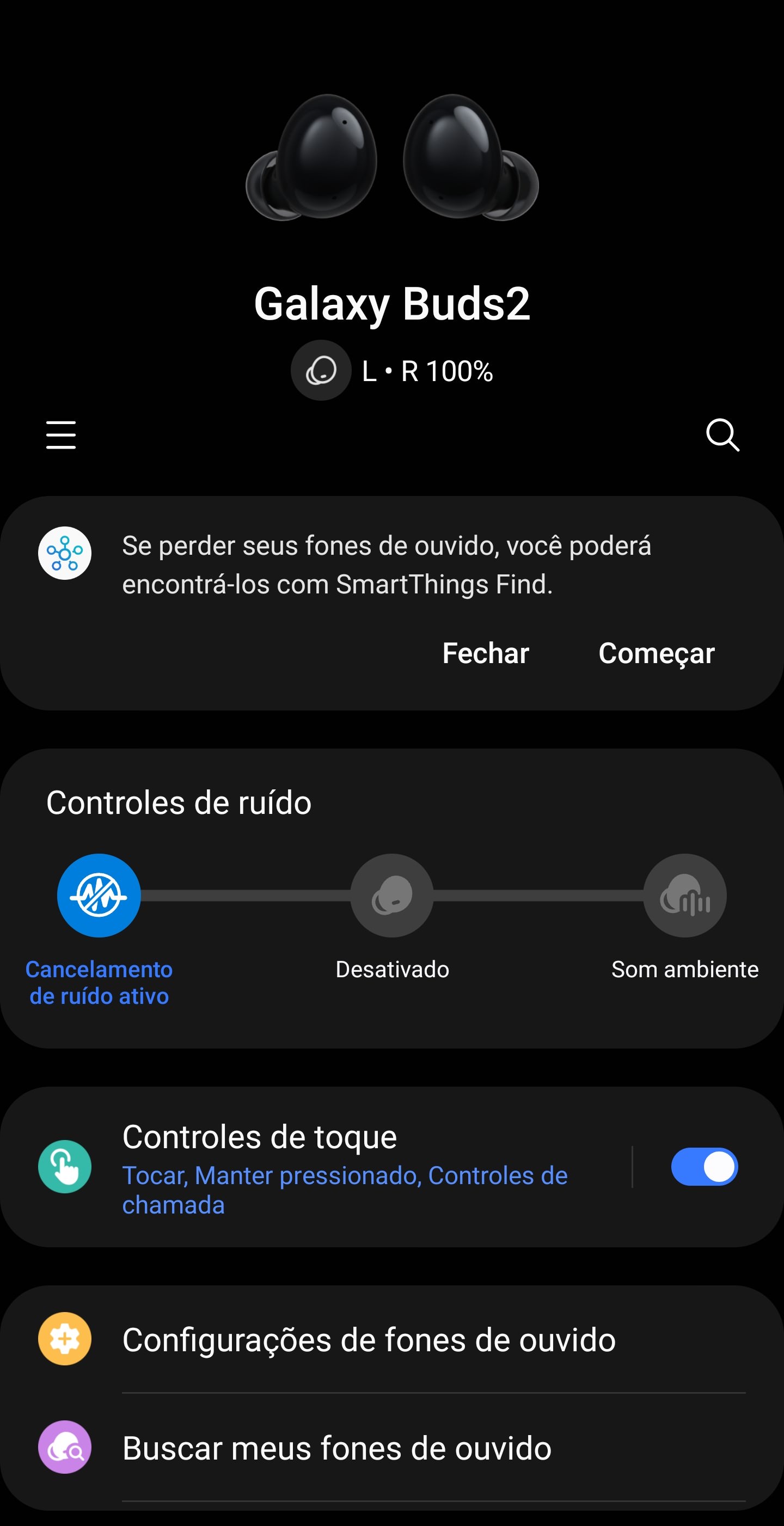 Caso você não tenha um celular da Samsung, você pode baixar o aplicativo “Galaxy Wearable” na Google Play Store. Eu instalei o App no meu Motorola e funcionou perfeitamente. Vai precisar que outro aplicativo seja instalado também, o “Galaxy Buds 2 Manager”, que já vai aparecer automaticamente para instalação quando você abrir o App “Galaxy Wearable”, então, é só confirmar a instalação.