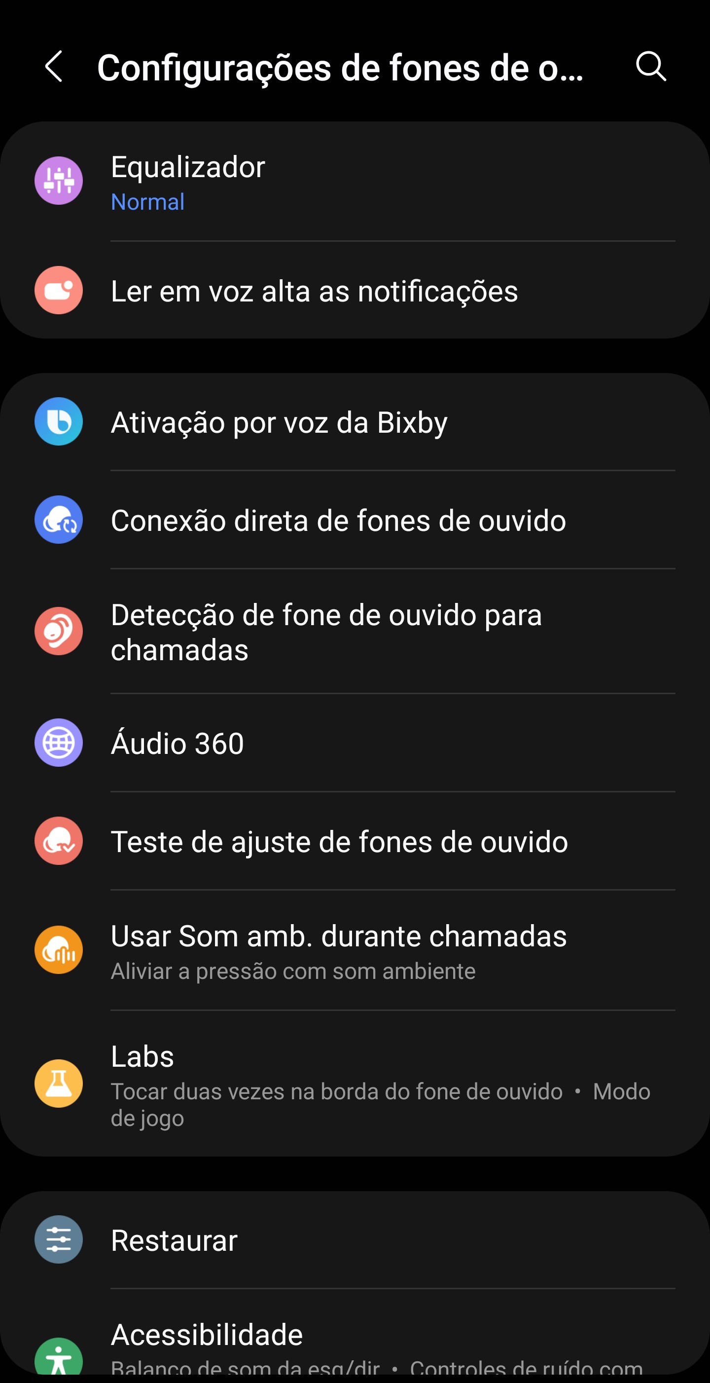 PS: Infelizmente celulares de outras marcas que não sejam Samsung, acabam não obtendo todos os recursos disponíveis no aplicativo “Galaxy Wearable”, como por exemplo, o 360 Áudio ou o Labs. O “Labs” possui o recurso do “modo jogo”, que na prática seria algo como um modo de baixa latência, para reduzir o tempo de envio do sinal para o fone.