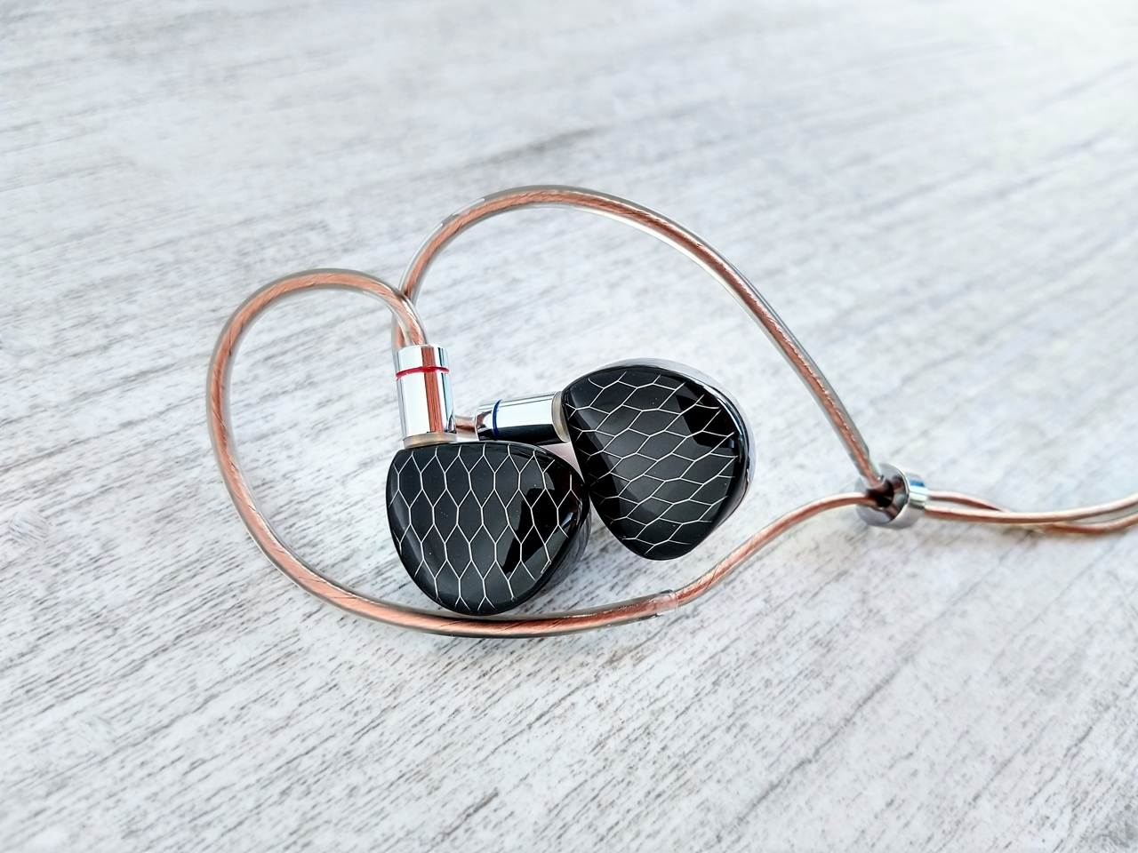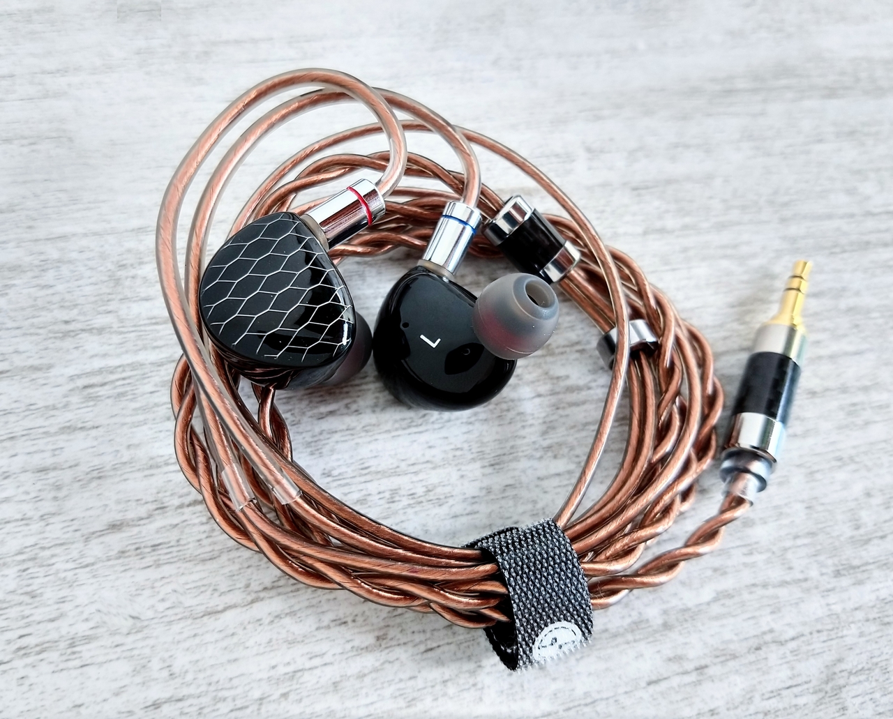 Cabo. O cabo do P1 MAX é de cobre (banhado a cobre) e tem realmente uma coloração de cobre. Digo isso porque o cabo do P1 (original) tinha uma coloração mais clara e reluzente, já o do P1 MAX é mais escuro. Eu confesso que o cobre esteticamente não é o material que mais me agrada, mas o cabo do P1 MAX não fez feio. É um ótimo cabo, não é pesado, não pega memória, fácil de enrolar pra guardar, tem um revestimento bem liso, bom ao tato. É um cabo que quase nunca embaraçou, mas também quando embaraçou foi tenso viu (coisas de fone a cabo). Quem viu a minha review do Letshuoer S12, viu que o cabo foi um ponto que achei não tão positivo, porque ele se mostrou um pouco pesado com o passar do tempo, e já aqui no cabo do P1 MAX o quesito peso não incomodou.