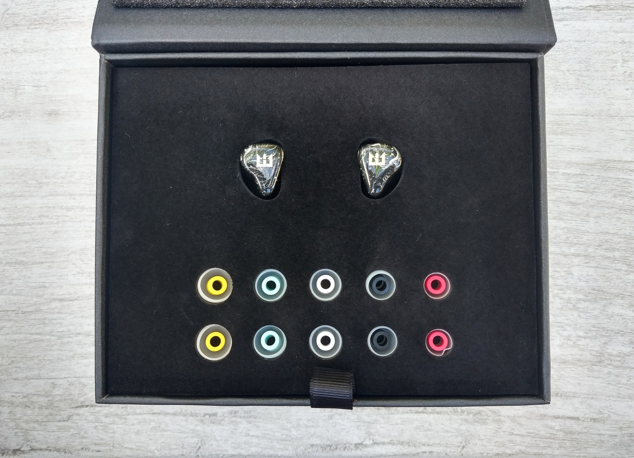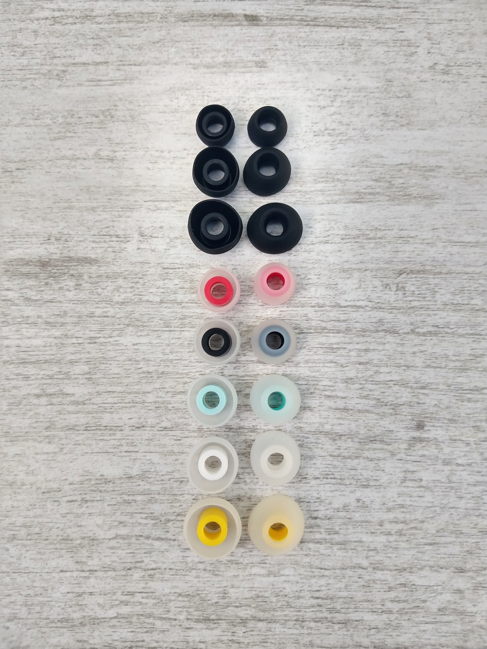 Eartips (ou ponteiras/borrachinhas). Vieram dois tipos diferentes em silicone, umas “normais” com o tubo colorido, nos tamanhos PP/P/M/G/GG, e outras nas cor preta em estilo “wide bore” (bocal aberto), nos tamanhos P/M/G. Não tenho costume de usar eartips wide bore, então, eu usei as eartips normais no tamanho M (tubo branco).