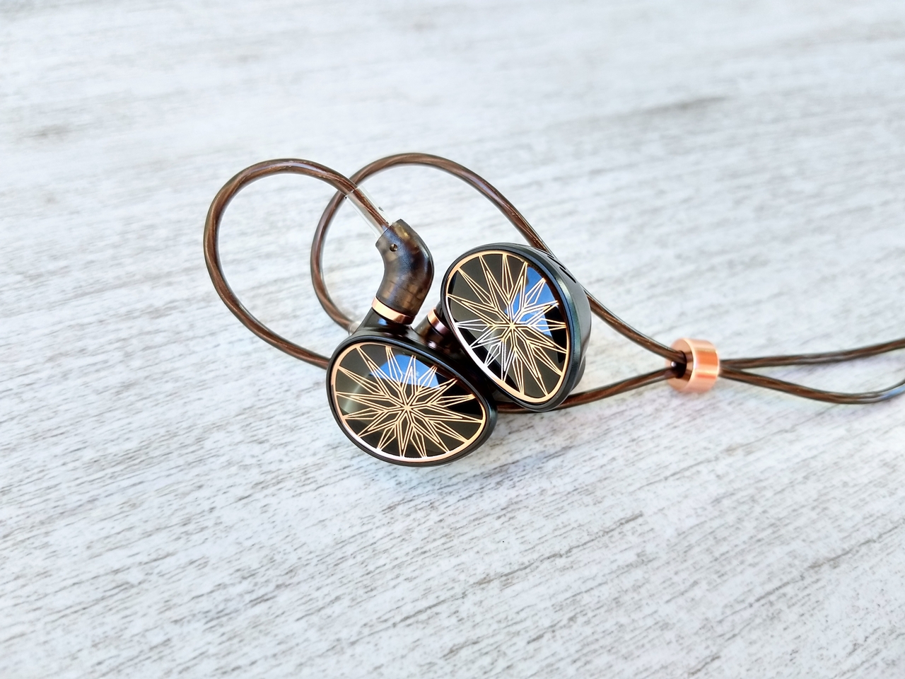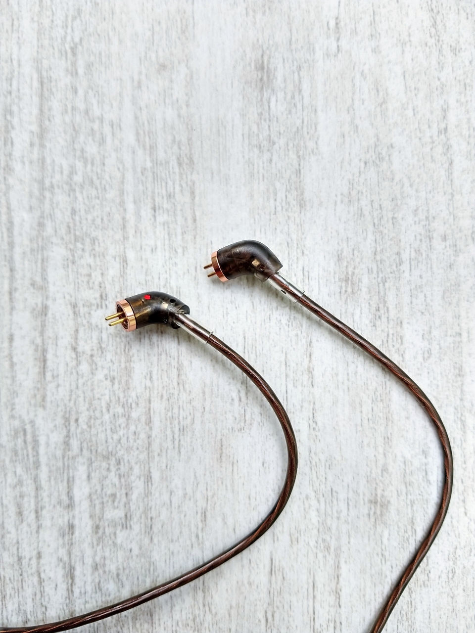 Cabo. Esteticamente é um cabo muito bonito e combinou com o layout do fone como um todo. Ele me lembrou bastante o cabo do Moondrop CHU, não só em estética, mas em algumas características físicas também. É um cabo leve e bem resistente, ele é revestido com um material plástico mais espesso, então acaba conferindo uma sensação como se fosse uma mangueira plástica ao tato (no meu entender, uma sensação não muito legal). Ele pega memória, do jeito que ele veio dobrado, do mesmo jeito ele ficou com aquelas ondulações. É um cabo que eu achei fácil de enrolar pra guardar, porém ele deu umas embaraçadas em alguns momentos. Senti um pouco de microfonia, e em parte acho que foi pela ausência do item que vou descrever no tópico abaixo.