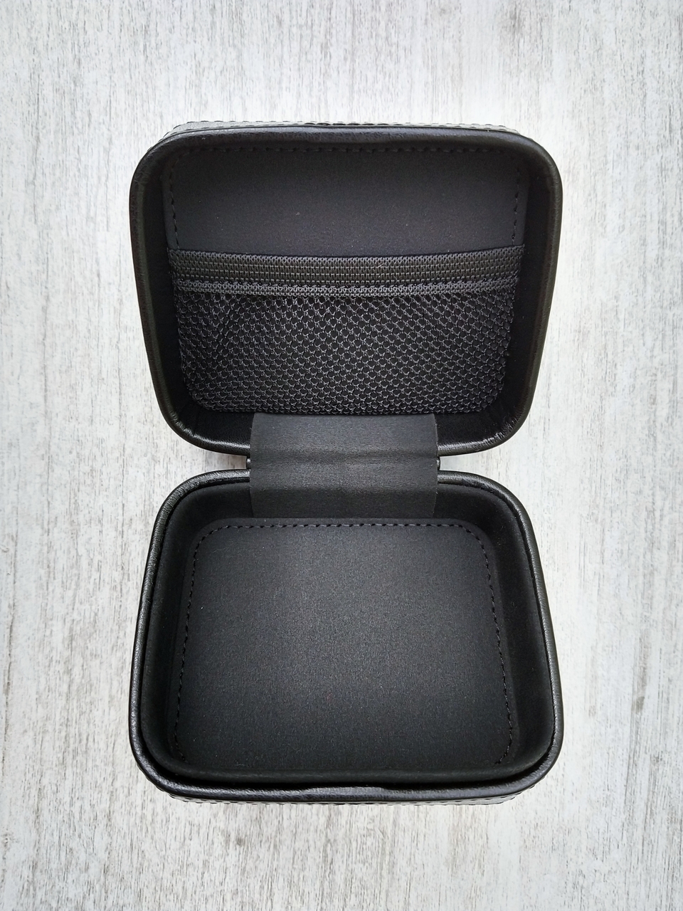 Case (ou estojo). É, aqui de todos os Cases que já tive, creio que esse é o que eu mais gostei até o momento. É basicamente esse tipo de Case que eu espero que venha em todos os fones. Além da beleza, é muito funcional, Case rígido com fechamento por magnetismo, tem um espaço interno muito bom. É revestido internamente com um material similar a uma camurça, e externamente é revestido por um material que a empresa chama de couro vegano (Vegan Leather), ou seja, é um couro sintético. Tem um logotipo escrito “Kylin”, que faz referência ao nome da série de fones produzidos pela Whizzer.