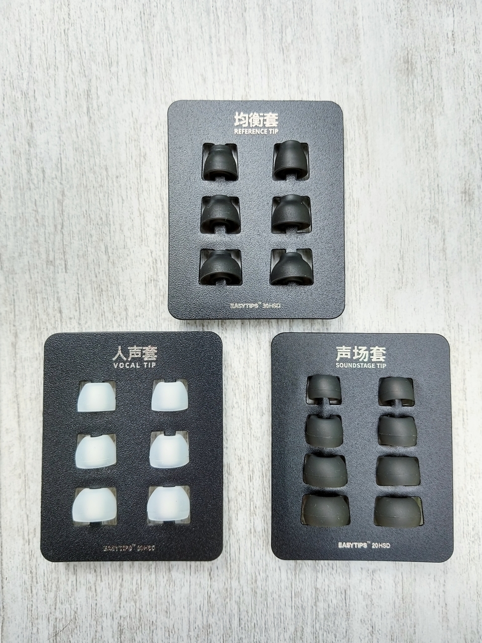 Eartips (ou ponteiras/borrachinhas). O fone veio com 3 tipos de eartips diferentes, todas 3 em silicone – (não veio ponteira de espuma). Essas eartips são denominadas pela empresa como “EasyTips”, e são elas: SS20 Soundstage tip (cinza escuro), VC20 Vocal tip (Branca), ET100 Reference tip (preta). PS: A Whizzer mudou o layout de algumas EasyTips após a fabricação do HE03D, basicamente a cor foi a principal alteração.